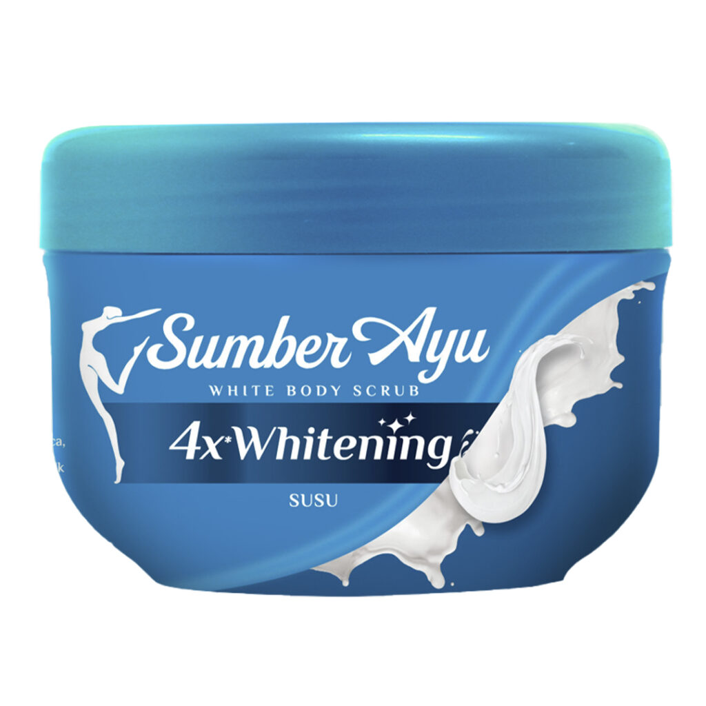 SUMBER AYU Lulur Mandi kini dengan ekstrak susu dan formulasi 4X Whitening yang lebih berkesan. Diperkaya dengan 4 bahan whitening – Niacinamide, Lactic Acid, Milk Protein, dan Titanium Dioxide, ia bukan sahaja membantu menanggalkan kotoran dan sel kulit mati dengan lembut, tetapi juga memberikan kulit badan yang lebih cerah, berseri, dan sihat.
